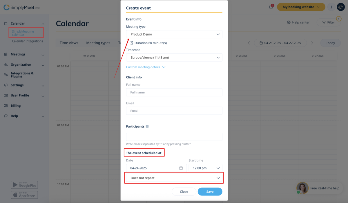 Recurring Meetings is a feature that lets you easily schedule repeat sessions directly from your internal SimplyMeet.me calendar. Perfect for setting up regular check-ins, training sessions, or consultations, all without repetitive manual scheduling.