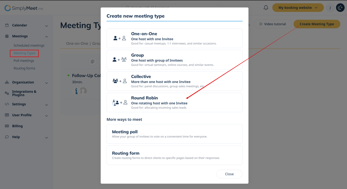 Note: To be able to create Round Robin Meeting Types and assign teammates you must be an owner of the organization. You must have at least two SimplyMeet.me paid licenses to be able to create an organization.